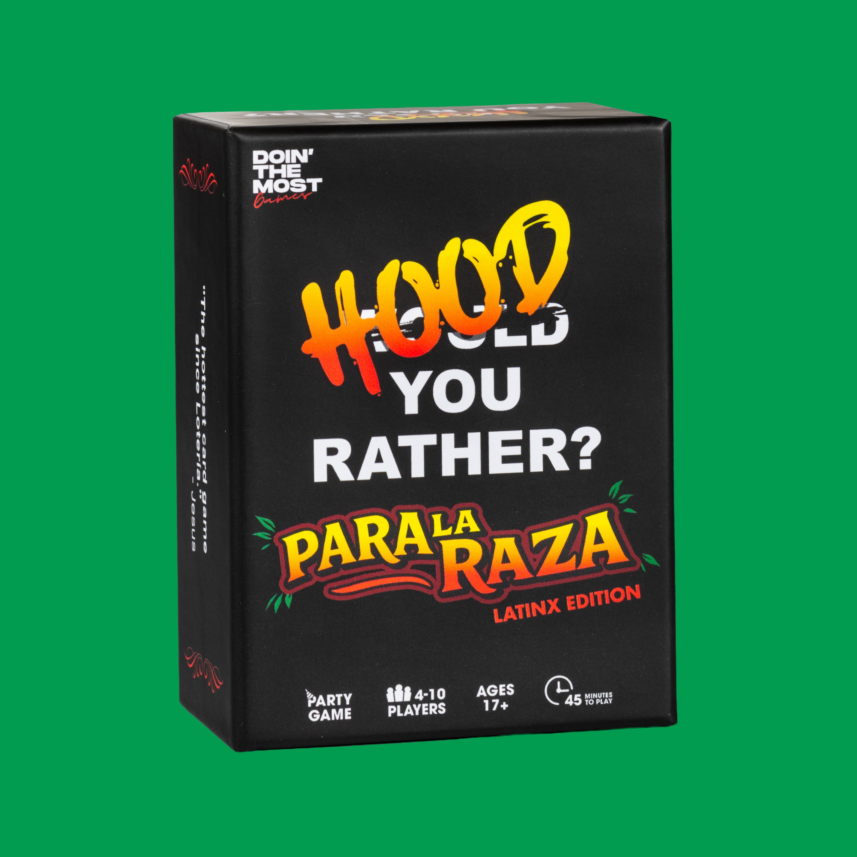 A twist on Would You Rather, with hilarious scenarios and hood culture inside jokes! With 200 cards that spark debates and laughter, it’s perfect for groups of 4-10, ages 17+.